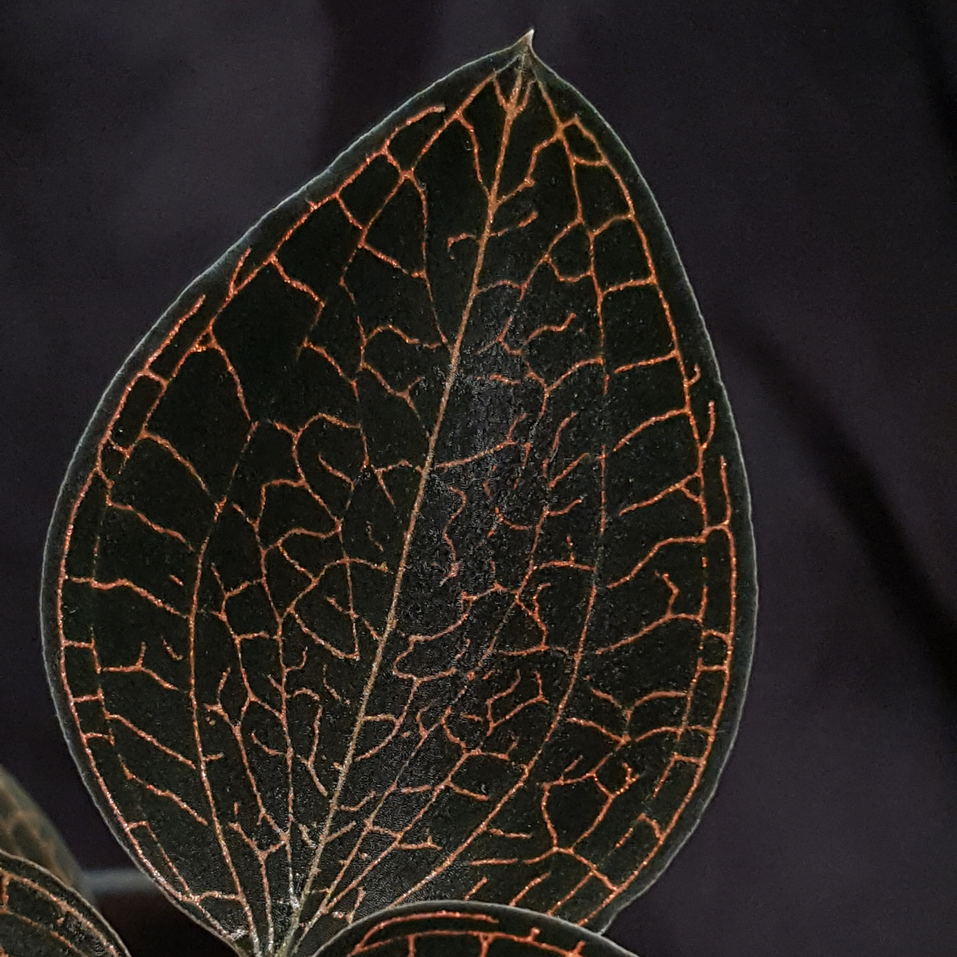 The reddish leaf veins on a dark background are very impressive. This is the hallmark of Anoectochilus roxburhgii ‘Firebird’. This cultivar should not be missing from any jewel orchid collection. Of the many jewel orchids I offer, Anoectochilus roxburghii ‘Firebird’ is one of the most difficult to photograph. It thrives at room temperature, moderate fertilisation and preferably high relative humidity. The substrate should only be moist, but never completely soaked. Please do not expose to direct sunlight. The pictures are exemplary, you will receive a similar plant.