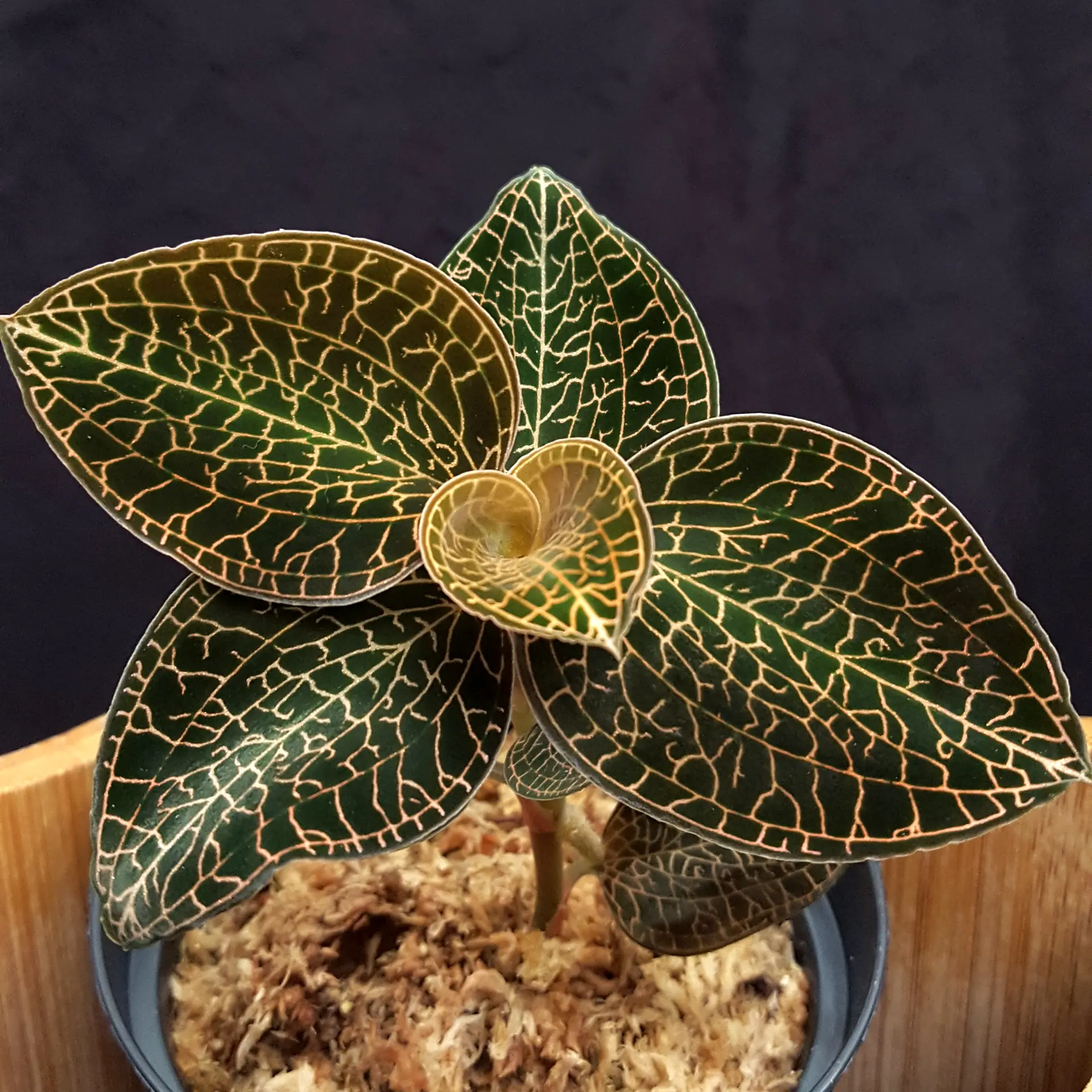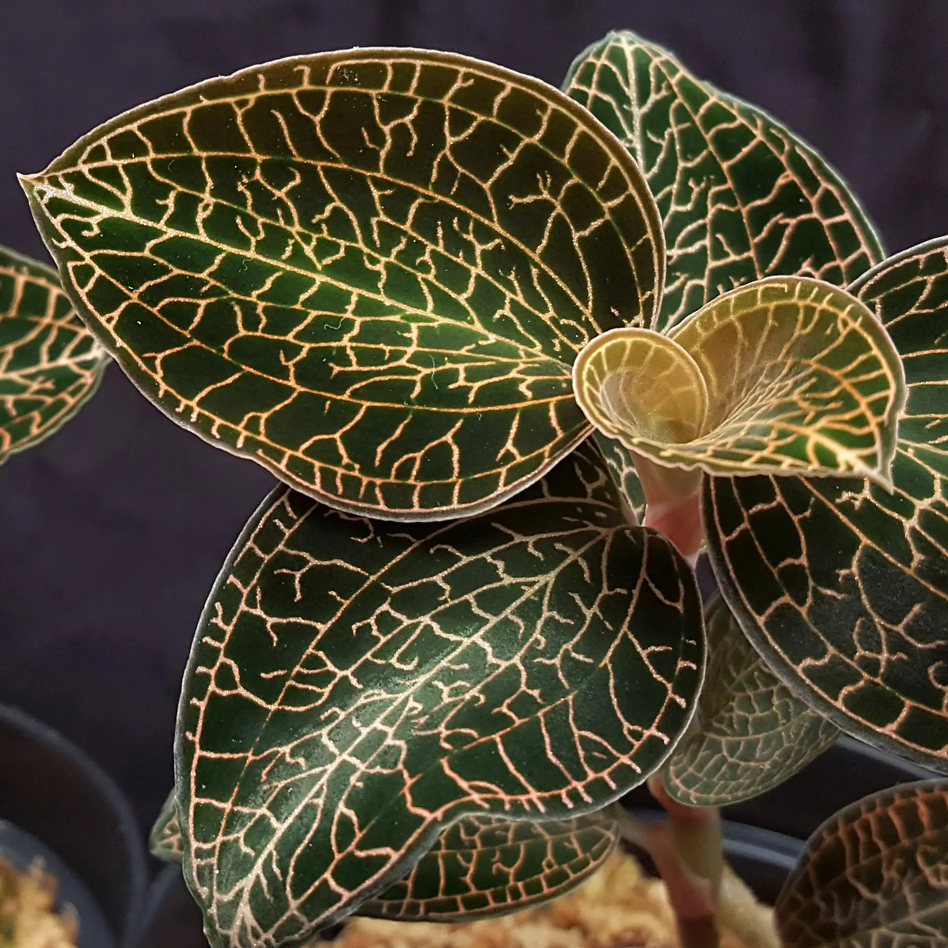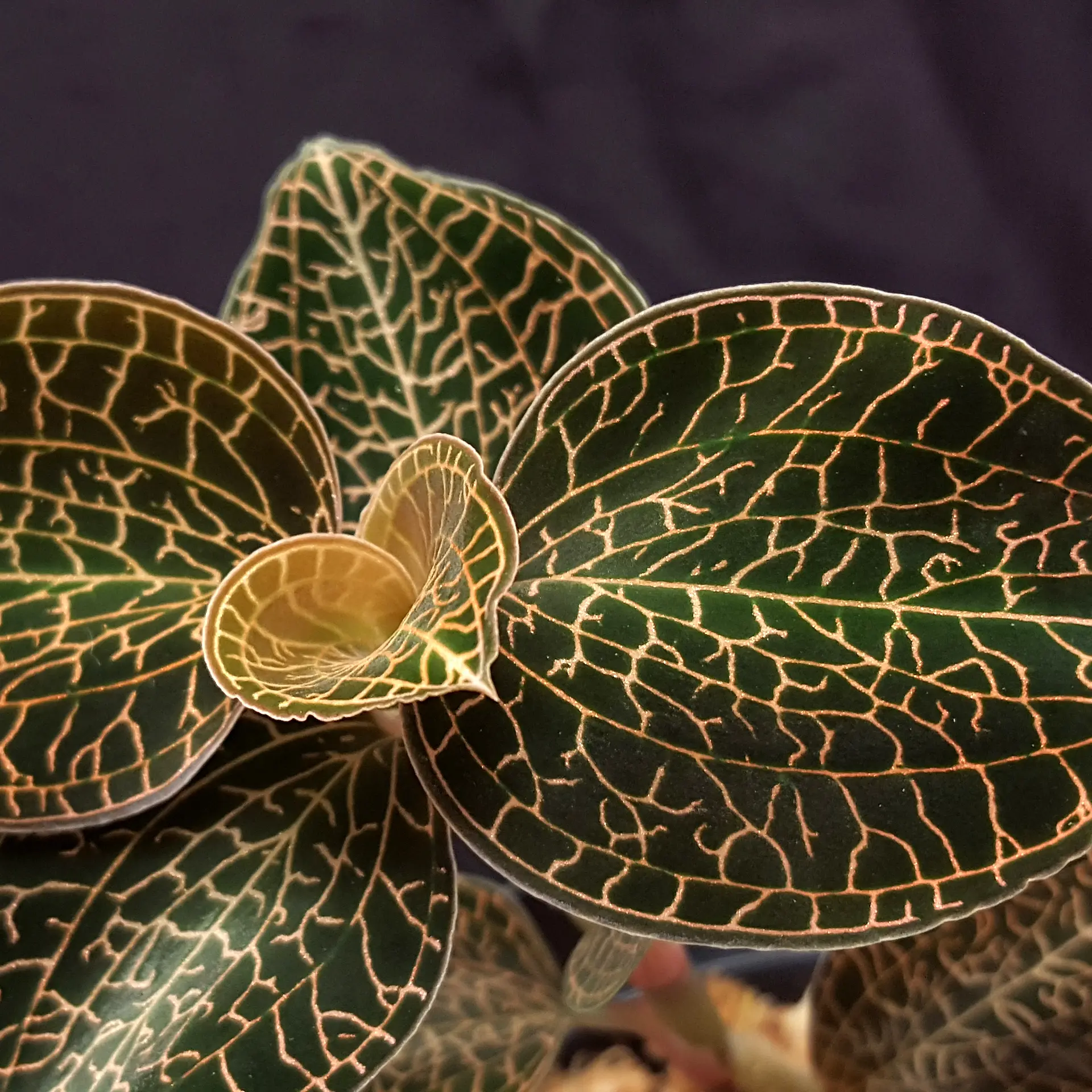 The golden-red veins of the jewel orchid Anoectochilus roxburghii ‘Salmon Dream’ stand out like small lava flows on the dark leaf base. What sparkles so conspicuously in the light is a good camouflage in the shade of the forest trees. Botanists assume that the leaf colouring that inspires us so much is a form of frass protection in the wild. Anoectochilus roxburghii ‘Salmon Dream’ does well in no direct sunlight, no waterlogging and little fertiliser at room temperature. Suitable for both beginners and advanced enthusiasts. The pictures shown are exemplary, the plant you purchase is similar to the pictures.