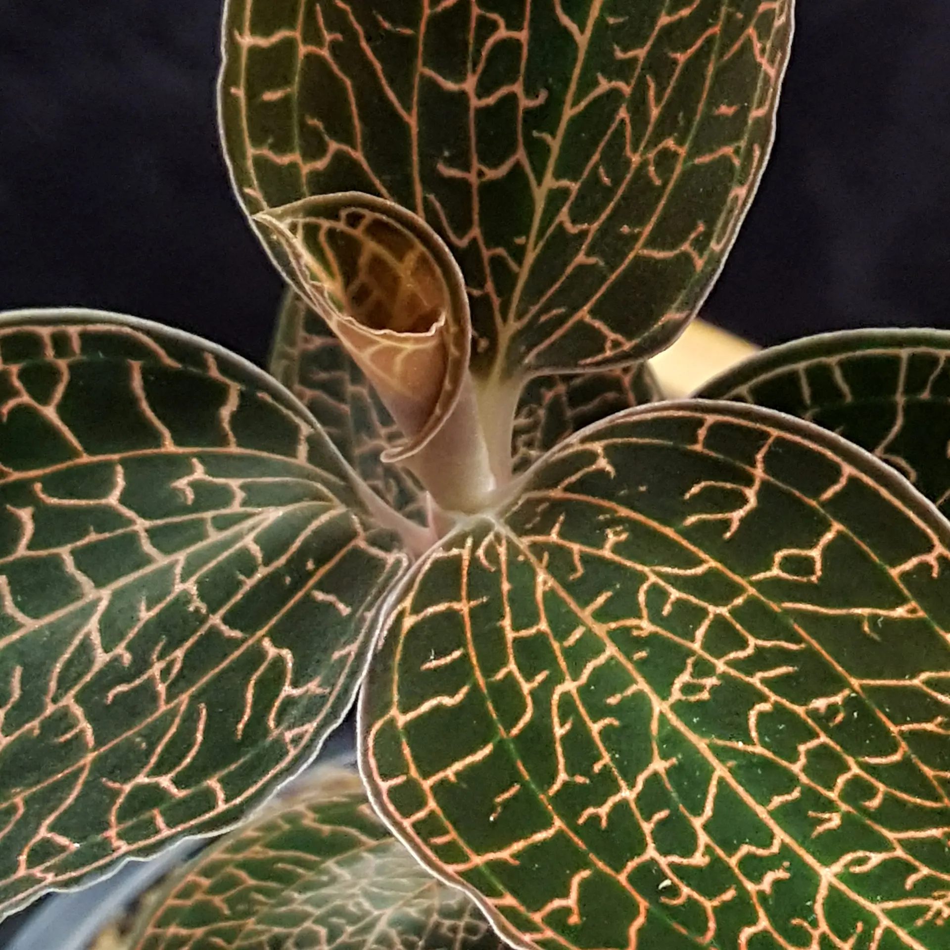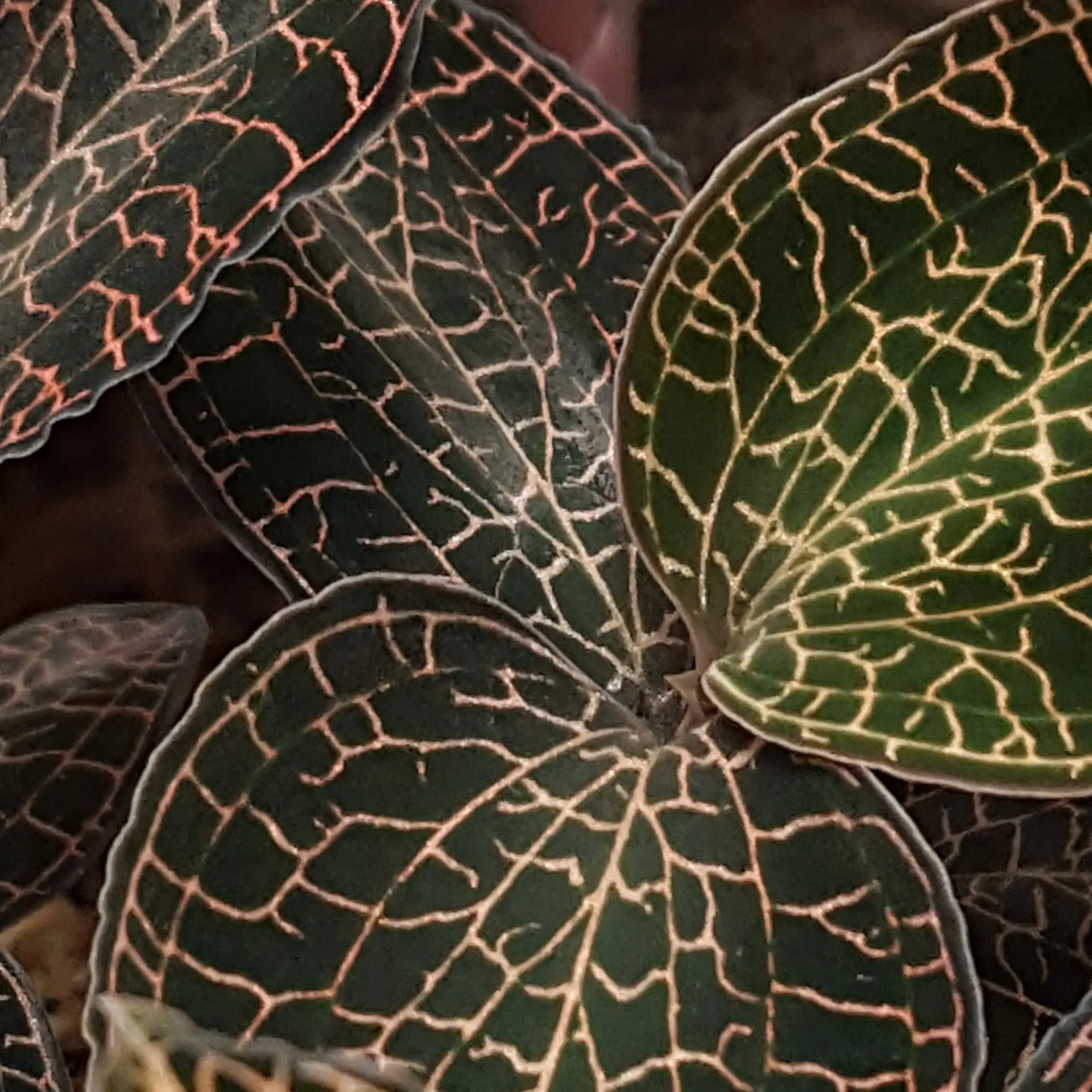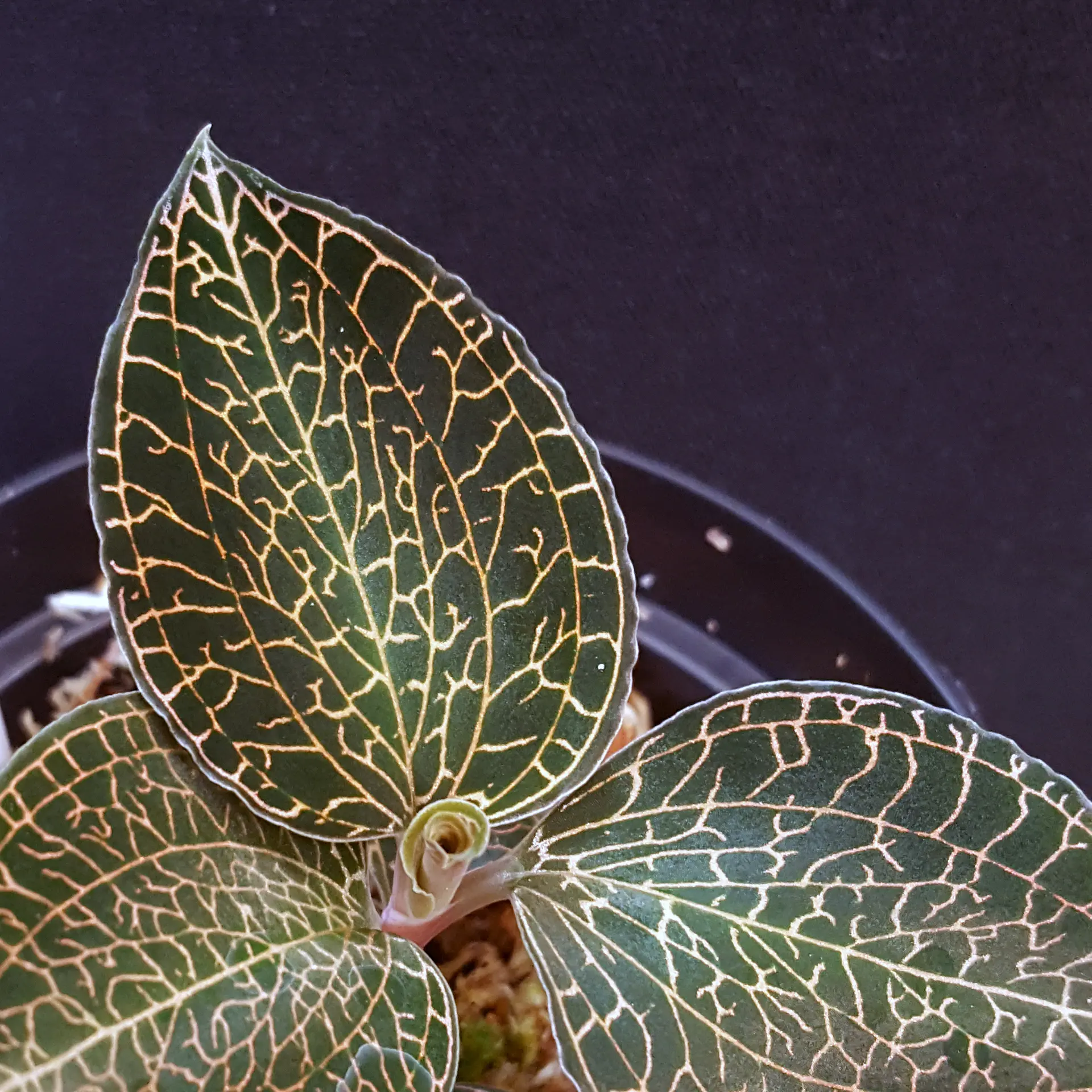The golden-red veins of the jewel orchid Anoectochilus roxburghii ‘Salmon Dream’ stand out like small lava flows on the dark leaf base. What sparkles so conspicuously in the light is a good camouflage in the shade of the forest trees. Botanists assume that the leaf colouring that inspires us so much is a form of frass protection in the wild. Anoectochilus roxburghii ‘Salmon Dream’ does well in no direct sunlight, no waterlogging and little fertiliser at room temperature. Suitable for both beginners and advanced enthusiasts. The pictures shown are exemplary, the plant you purchase is similar to the pictures.