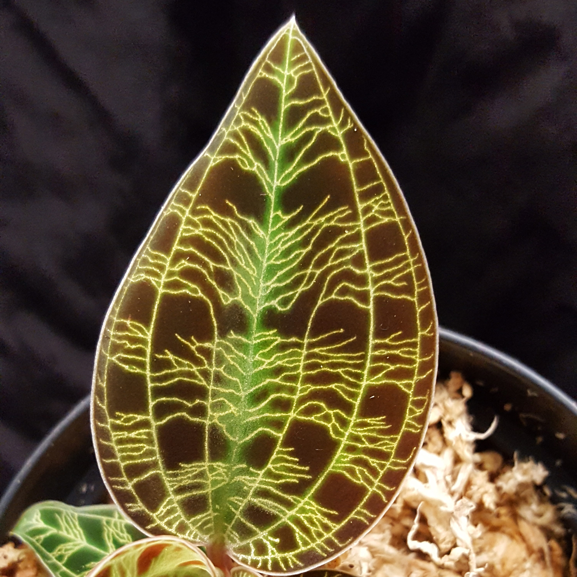 Hundreds of tiny flashes of stardust adorn the leaves of Macodes petola ‘Exotic Jungle’ [Bl.] Lindl. 1840. In the wild, it can be found in the tropical rainforests of Sumatra, the Philippines, Borneo and Malaysia. This jewel orchid can also be found on Iriomote Island in Japan. This island is also known as the ‘Galapagos of the East’ due to its abundance of species. Macodes petola ‘Exotic Jungle’ is one of several cultivars of Macodes petola that are available. It thrives well in temperate to warm conditions. We pot it in Sphagnum moss, which should always be moist. However, waterlogging should be avoided at all costs, otherwise stem rot can develop. Please avoid direct sunlight. Fertilise sparingly as this jewel orchid grows slowly. You purchase a younger plant.