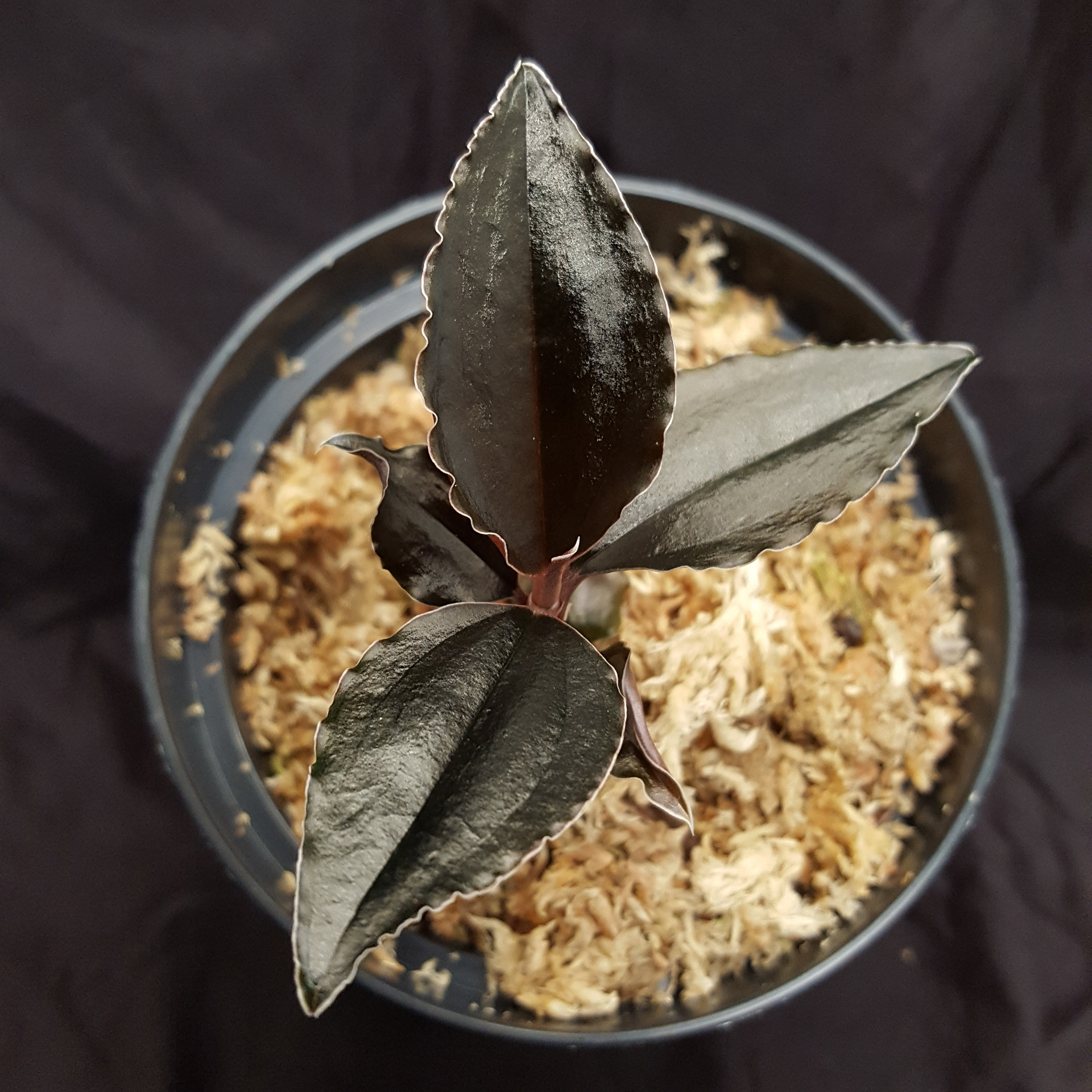 Odontochilus is a genus of jewel orchids that is very rarely offered. In the wild, they thrive in the undergrowth of moist forests. The special feature of Odontochilus elwesii ‘ New Moon’ C.B.Clarke ex Hook.f. 1890 are the deep red, almost black coloured leaves, which are difficult to photograph due to their shiny surface. This small jewel orchid is found in Vietnam, Thailand, China and Myanmar and is certainly unique due to its appearance. The dark leaves are framed with a fine white line. It thrives in high relative humidity at room temperature, but should not be exposed to direct sunlight. Please keep the Sphagnum substrate moist at all times, but ensure that it is not dripping wet.The photos are exemplary, you are purchasing a similar plant.
